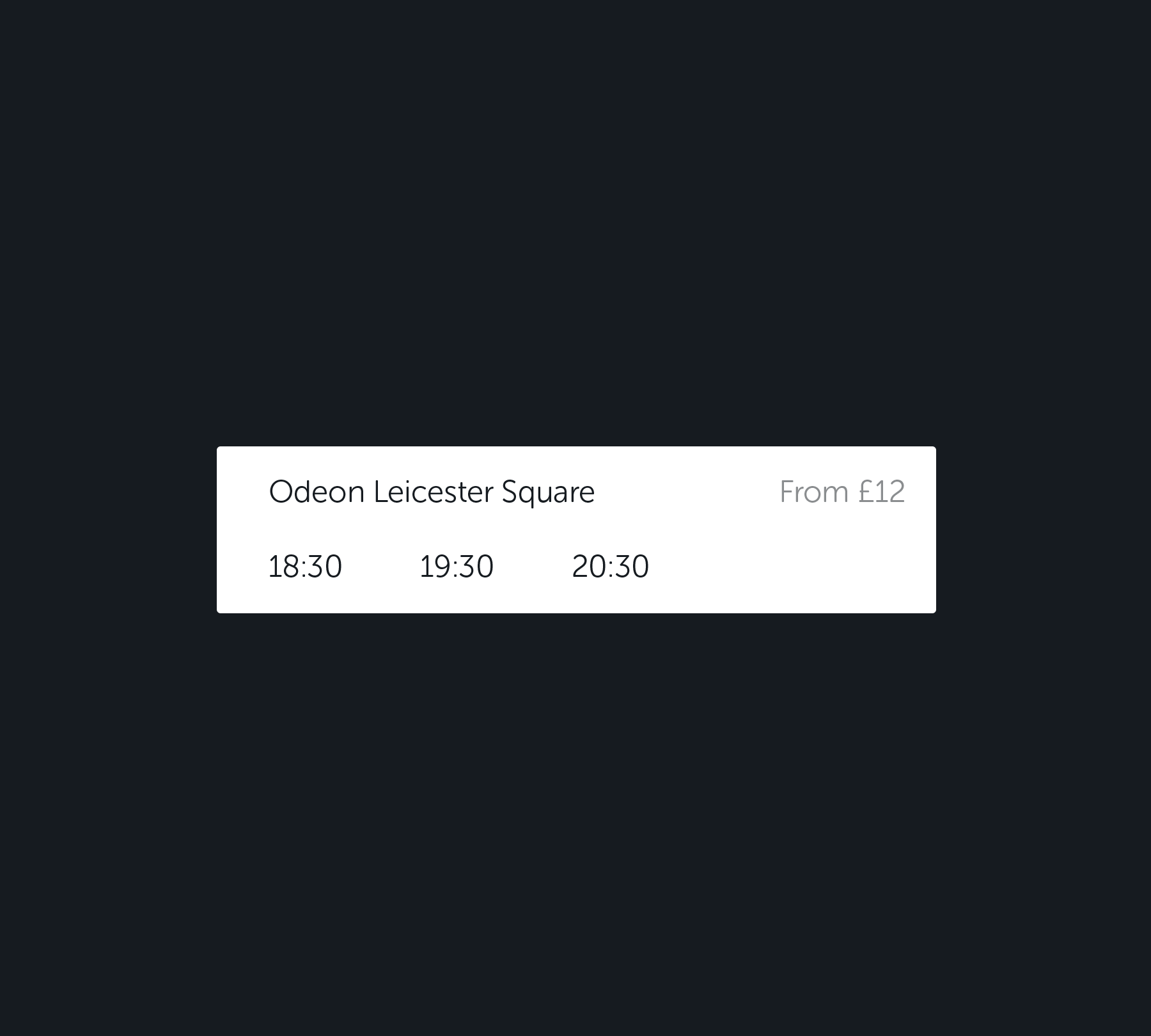 Since an average film in London has hundreds of showtimes per day, displaying a high volume of information in a limited space was a challenge. Clustering the showtimes into film or a cinema based cards allowed to separate showtimes into easily distinguishable and compact groups. The cards allowed us to go through a series of layout experiments, while learning the most meaningful data to be displayed along with the showtimes.