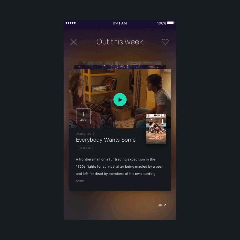 Finally, to create a habit of coming back and check what's new this week (and hopefully increase the retention rate), a Tinder-like interaction of upcoming films was prototyped and tested.