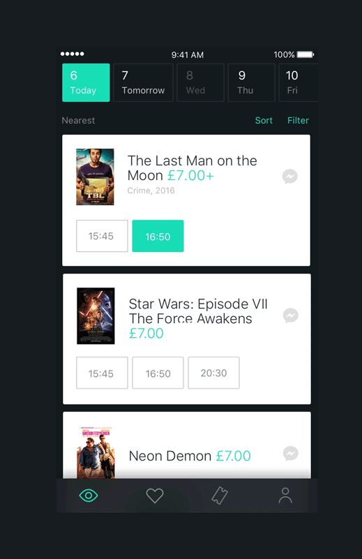 Talking to the users, it soon became apparent that they were surprisingly loyal to their favorite cinemas. In fact, a usual cinema goer would frequent the average number of 3 cinemas, usually in their neighborhood, close to work or simply ones that they liked. Building on that insight, we introduced a custom list of favorites cinemas right at the top on the top of film feed.