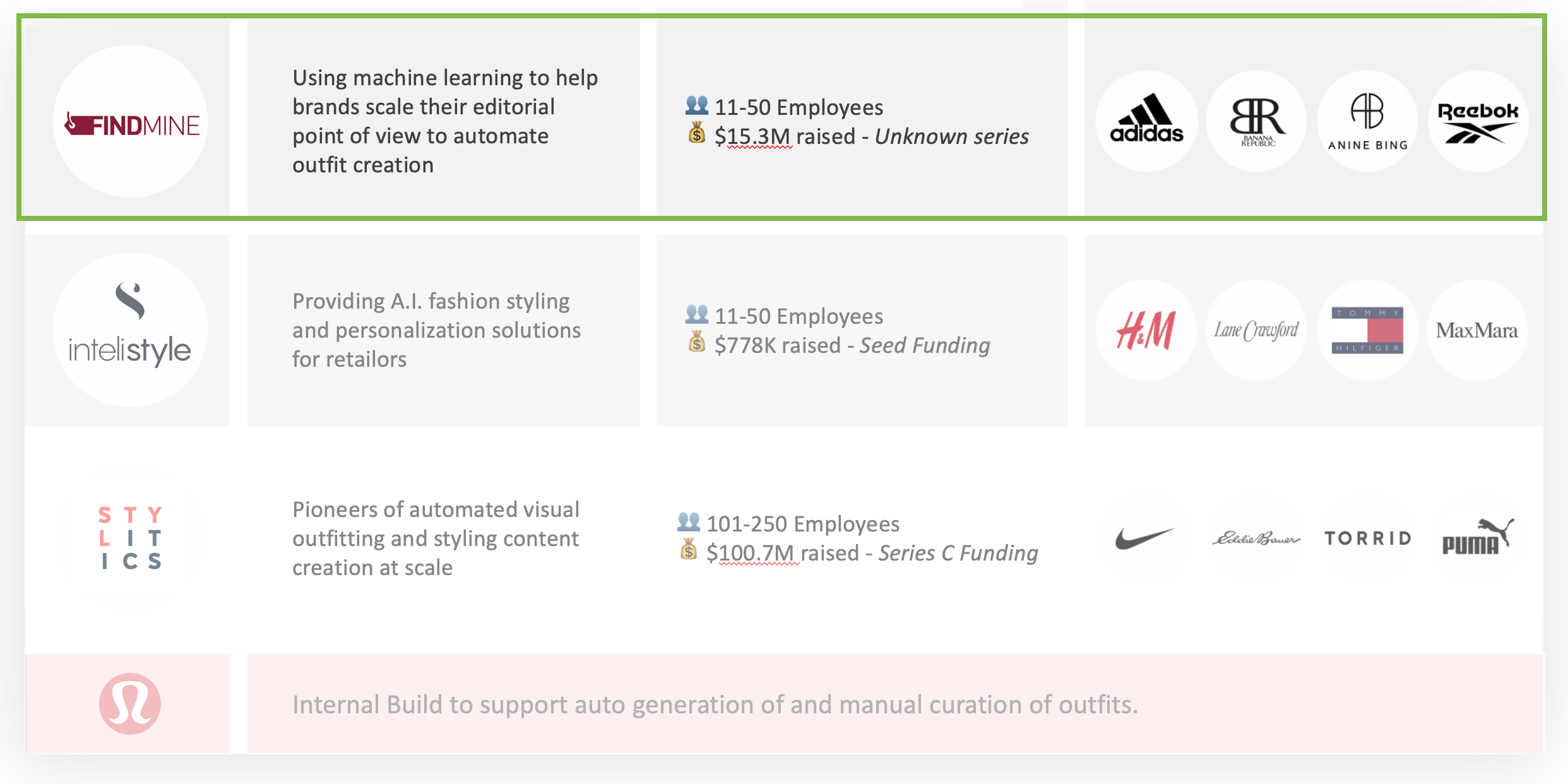 We conducted a build vs buy analysis from a UX/UI, Product and Tech perspective to determine which Ai vendor will be ideal for creating flat-lay images and smartly curate outfits through machine learning.